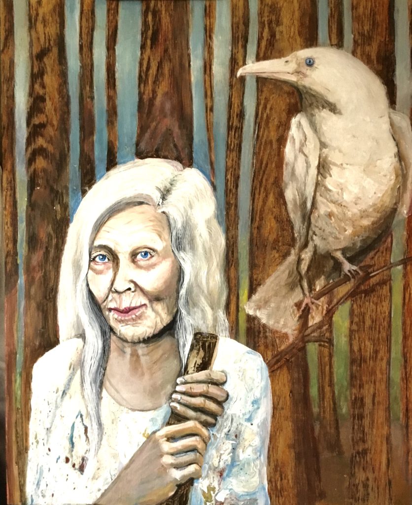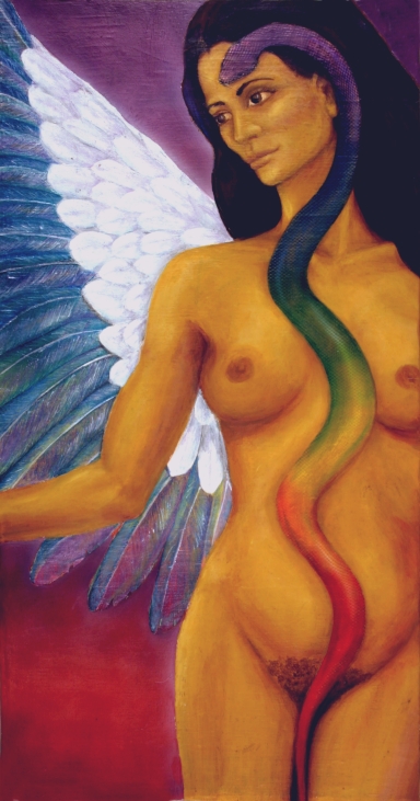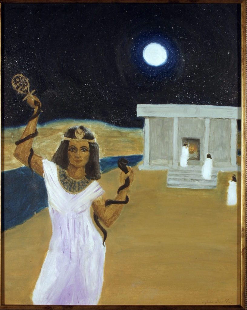it is said, that in the antiquities of Egyptian culture that the initiation of the Isis priestesses was achieved through the handling of venomous snakes. If the priest has handled the snakes, and they did not bite her, she became an issue, and if they did bite her she would die. The test was to handle the snakes without fear because that’s what would make them strike. To be a master of one’s own fear is a super power! This is an early work created in 1989. It is oil on 16 x 20” canvas. $2300