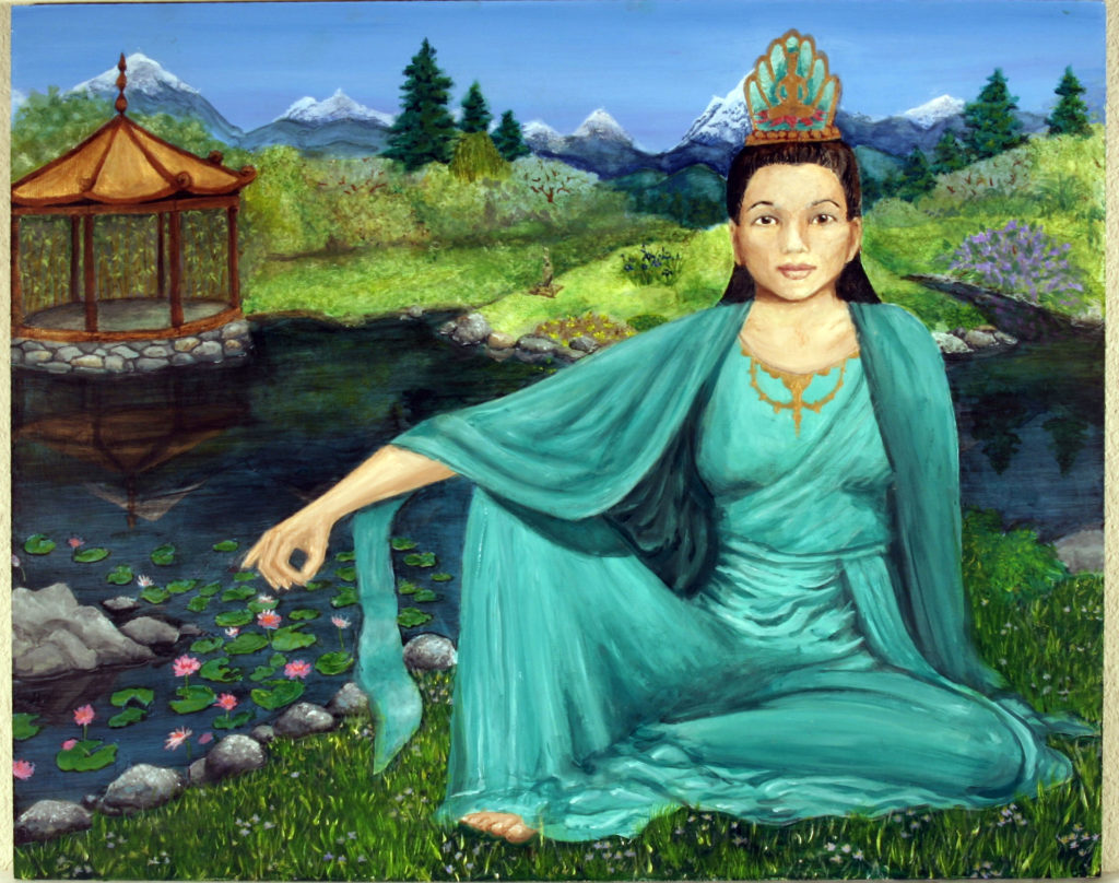 Quan Yin is the Bodhisattva of Infinite Compassion. A bodhisattva is a figure who has achieved enlightenment, and may pass into nirvana… However, bodhisattvas elect instead to remain in this world, easing the suffering of all beings and helping others attain enlightenment. Quan Yin’s vow is to save those in danger or caught in suffering. Quan Yin is said to take on more than thirty different manifestations in quests to aid victims. In the pose a royal ease, she expresses the principle of Lalita, or sacred play. It is an active aspect of the bodhisattva where she transforms & heals with play and ease. Original- acrylic on Masonite.